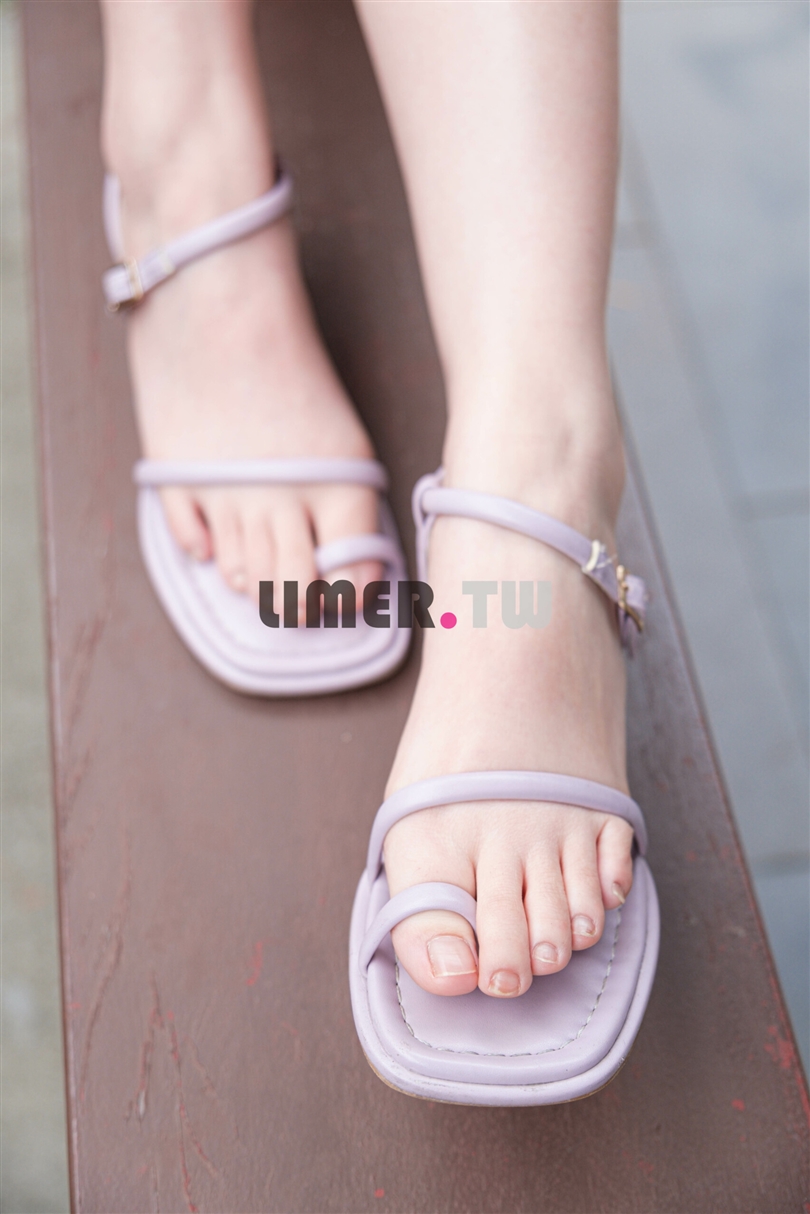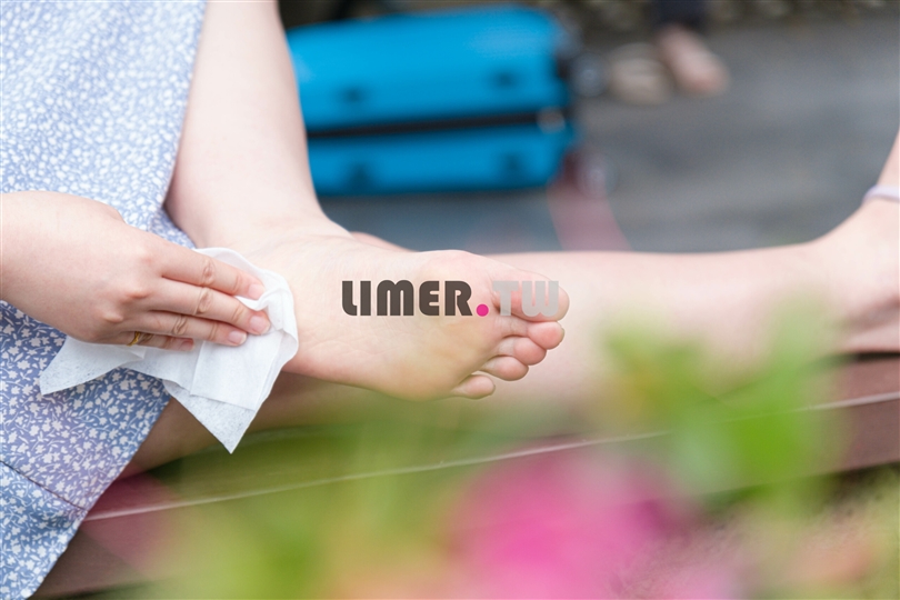 拍攝時妹子緩緩將涼鞋拖掉,拿著濕紙巾擦拭著腳底