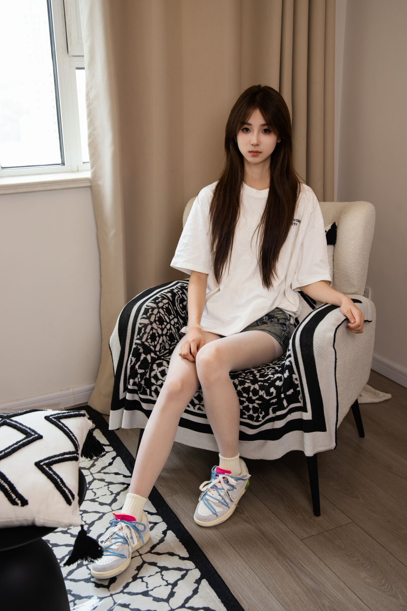 足愉心摄影第61期:模特小瑶(搭配:白色体恤、牛仔短裤、滑板鞋、白色丝袜、白色棉袜)