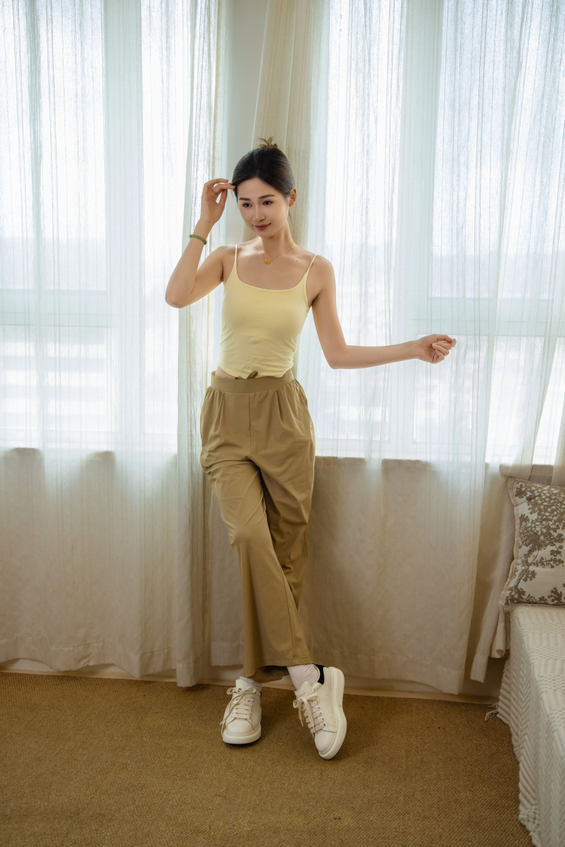 搭配内容:白色吊带、棕色长裤、白色丝袜、运动鞋、裸足