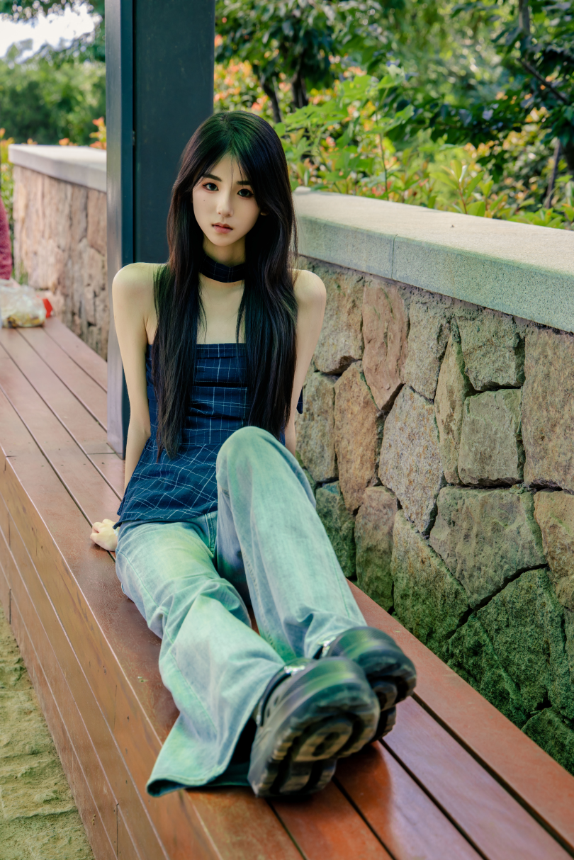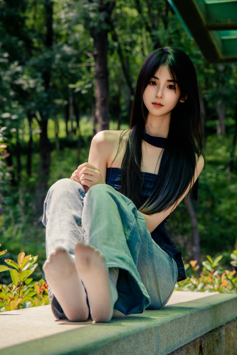 足愉心摄影第49期:模特小瑶(搭配:蓝色格子吊带、牛仔长裤、白棉袜、洞洞鞋、裸足)