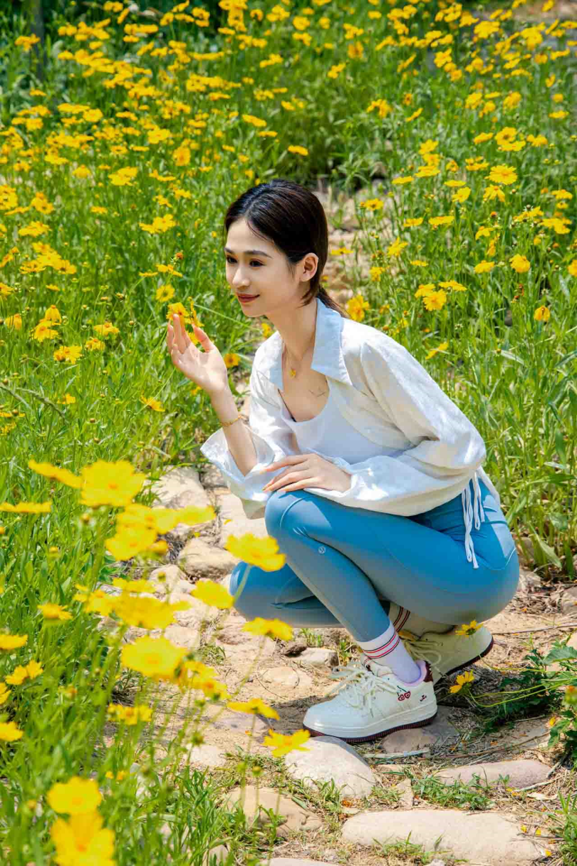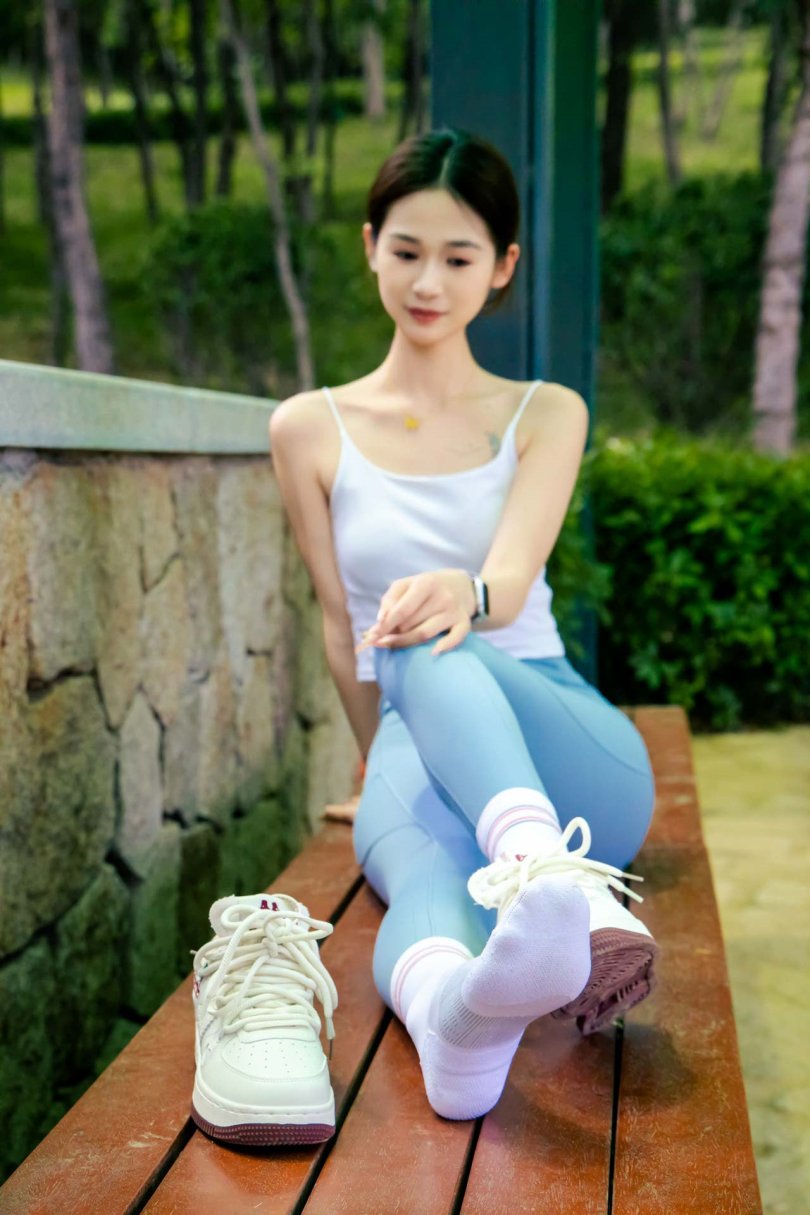 足愉心摄影第43期:模特沐晴(搭配:白T恤、蓝色瑜伽裤、白色棉袜、运动鞋)