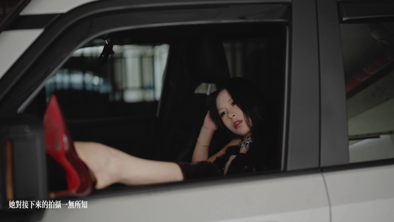 然后我把她脚锁在汽车头枕上,她并不知道接下来要拍什么。