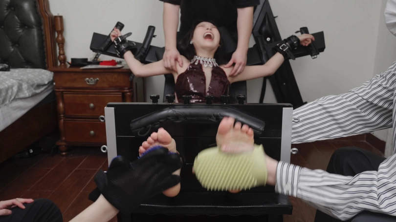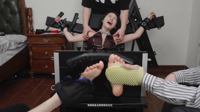 视频内容:随后我把艾米绑在束缚椅上面,她超怕痒所以很抗拒。